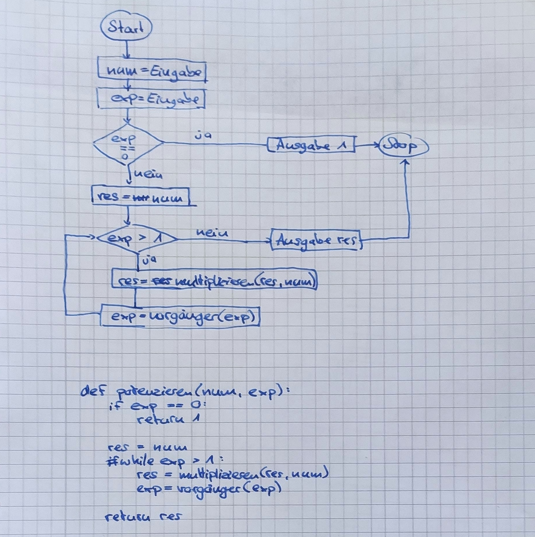 - Entwerfen Sie einen Programmablaufplan für das Potenzieren von Zahlen. Sie dürfen dafür nur folgende Operationen verwenden: addieren(sum1, sum2), multiplizieren(faktor, faktor2), nachfolger(zahl), vorgänger(zahl).