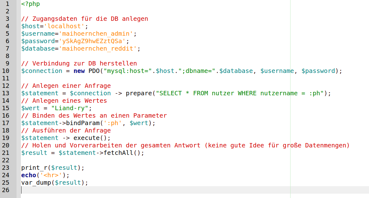 Erstellen und testen Sie eine PHP-Datei, die ähnlich wie das Beispiel eine beliebige Anfrage auf Ihrer Beispieldatenbank ausführt. Laden Sie die PHP-Datei im Lernraum hoch.