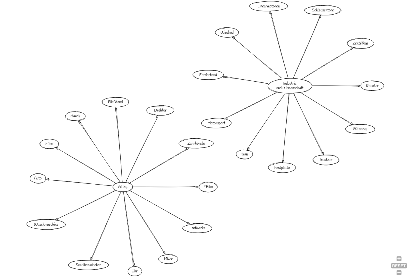 ## Elektromotoren Kurze Sammlung an Einsatzgebieten! > Notieren Sie drei Anwendungen aus dem Alltag. > Notieren Sie drei Anwendungen aus Industrie und Wissenschaft. 5 Minuten ---  --- ~~~dot digraph G { graph [fontname = "Handlee"]; node [fontname = "Handlee"]; edge [fontname = "Handlee"]; bgcolor=transparent; layout=circo; Alltag -> EBike; Alltag -> Zahnbürste; Alltag -> Drehtür; Alltag -> Fließband; Alltag -> Handy; Alltag -> Föhn; Alltag -> Auto; Alltag -> Waschmaschine; Alltag -> Scheibenwischer; Alltag -> Uhr; Alltag -> Mixer; Alltag -> Laufwerke; i [label="Industrie \n und Wissenschaft"]; i -> Roboter; i -> Zentrifuge; i -> Schleusentore; i -> Linearmotoren i -> Windrad; i -> Förderband; i -> Motorsport; i -> Kran; i -> Festplatte; i -> Trockner; i -> Güterzug; } ~~~ --- ## Aufgabenstellung Erklären Sie die Funktionsweise des einen oder anderen Elektromotors. - Gleichstrommotor - Wechselstrommotor - Schrittmotor (Stepper) --- ## Brushless > Regelelektronik nötig! https://studyflix.de/elektrotechnik/burstenloser-gleichstrommotor-1426 https://www.ulrichradig.de/home/index.php/avr/brushless-motor-controller --- ## 3-Phasen Drehstrommotor https://studyflix.de/elektrotechnik/drehstrommotor-1338 --- ## 3-Phasen Drehstrommotor  --- ## 3-Phasen Drehstrommotor  --- ## 3-Phasen Drehstrommotor  ---
