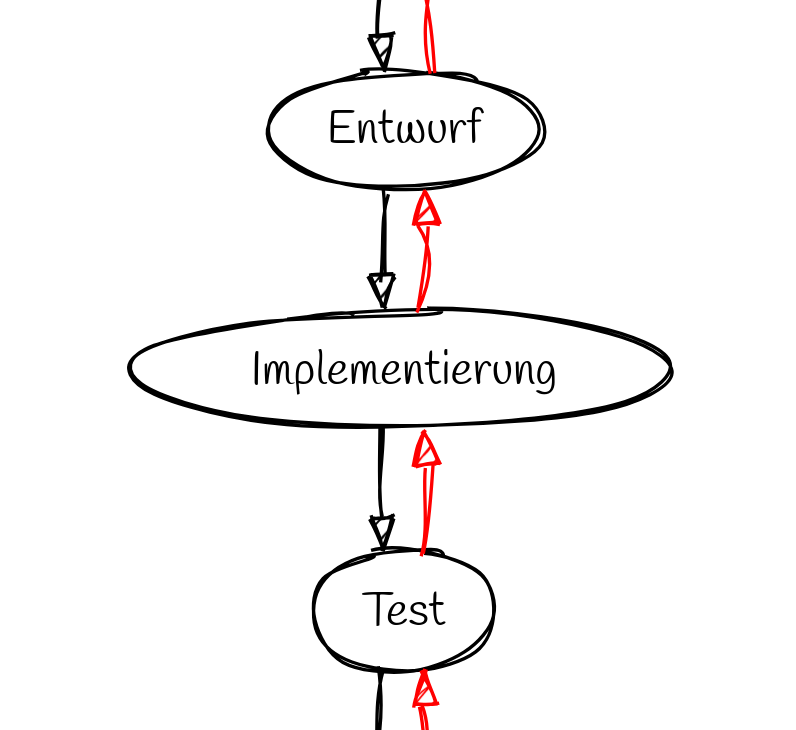 # Wasserfallmodell > sequentiell (mehr oder weniger strikt) > seit den 50er Jahren > ursprünglich in Bau und Produktion > einfach, weit verbreitet --- ## Beispielgrafik aus dem Netz  > 6 Phasen, andere Namen > frühe Phasen kommen oft zu kurz ---  --- ## Initialisierung  - Problembeschreibung - Projektziele - Grobe Projektbeschreibung - Grober Projektplan - Kostenabschätzung - Angebot an den Kunden --- ## Konzept  - Wünsche des Kunden - auswerten - aufschreiben (Papier) - am Ende: Pflichtenheft Plichtenheft: Daten und deren Zusammenhänge verbal beschrieben (semantisches Datenmodell) --- ## Entwurf  - eigentliche Entwicklung - Ergebnis: Programmspezifikation - alle **Einzelheiten** beschrieben > div. Technologien: Je einfacher, desto besser --- ## Implementierung  **Entwurf** ==(Programmierung)=>> **Programm** **Entwurf** ==(Konstruktion)=>> **Prototyp** --- ## Test  - zwei Arten - Programmtest: Teile auf logische Konsistenz - Benutzertest: unter Produktionsbedingungen durch ausgesuchte Benutzer --- ## Installation  - Bei Software: Installationsroutine - Sonst: Einbau, Aufbau beim Kunden > Auslieferung --- ## Wartung  - Anwenderschulungen - Beseitigen von weiteren Fehlern - Programmerweiterungen --- ## Rückkopplung > Sinnvoll eine Phase zu wiederholen? - falsche Annahmen - neue Erkenntnisse - unrealistische Planung - fehlende Kompetenz - zu wenig Geld --- ## Rückkopplung > Sinnvoll eine Phase zu wiederholen?  ---  --- ## Auffällig für Software-Projekte | Phase | Anteil | Programmieren | |---|---| ---| | Initialisierung | 0,14 | nein | | Konzept | 0,14 | nein | | Entwurf | 0,14 | nein (vielleicht) | | Implementierung | 0,14 | **ja** | | Test | 0,14 | nein (teilweise) | | Installation | 0,14 | nein (teilweise) | | Wartung | 0,14 | nein (teilweise) | --- # Quelle - https://wiki.ibkastl.de/view/Wasserfallmodell - https://www.scnsoft.de/blog-pictures/softwareentwicklung/modelle-der-softwareentwicklung/1-wasserfall-.png alle abgerufen: 02.04.2025 --- # Grafiken ... gerendert mit https://sketchviz.com/ ~~~dot Initialisierung -> Konzept -> Entwurf -> Implementierung -> Test -> Installation -> Wartung Wartung -> Installation -> Test -> Implementierung -> Entwurf -> Konzept -> Initialisierung [color=red] ~~~
